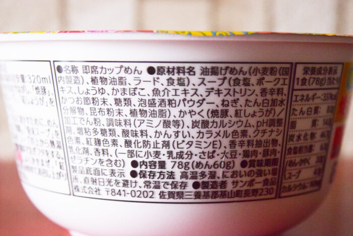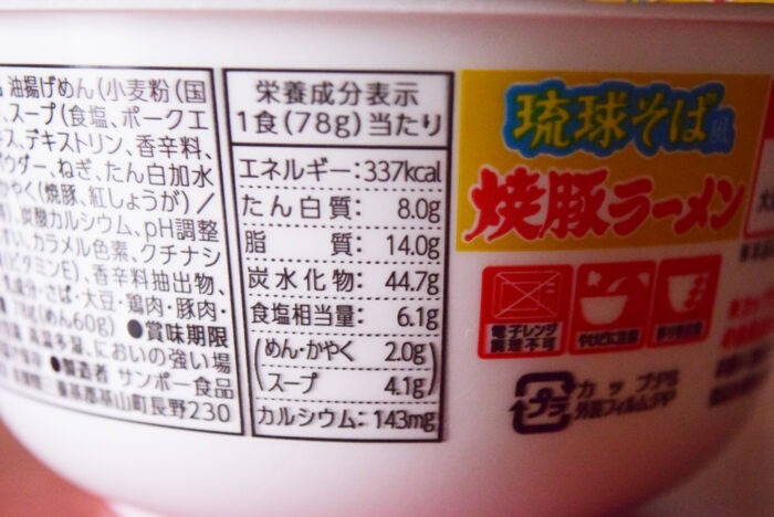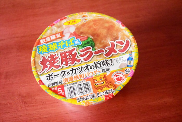 2026年4月に「サンポー 焼豚ラーメン 琉球そば風」がスーパーにて新商品として販売していました。こちらの商品は2025年4月にも販売していたので、期間限定で売られているカップ麺になります。