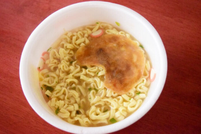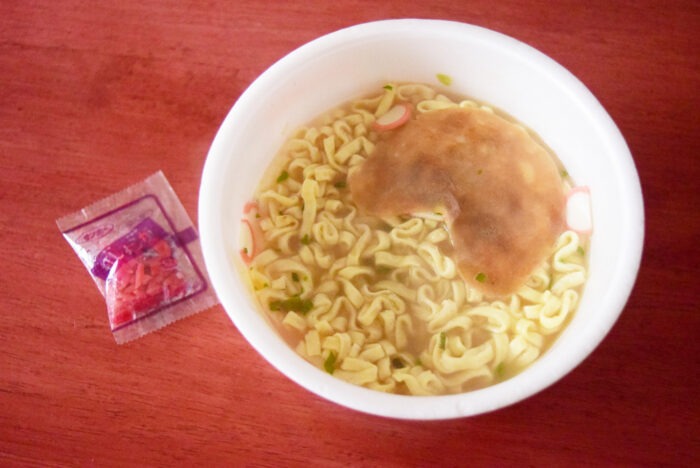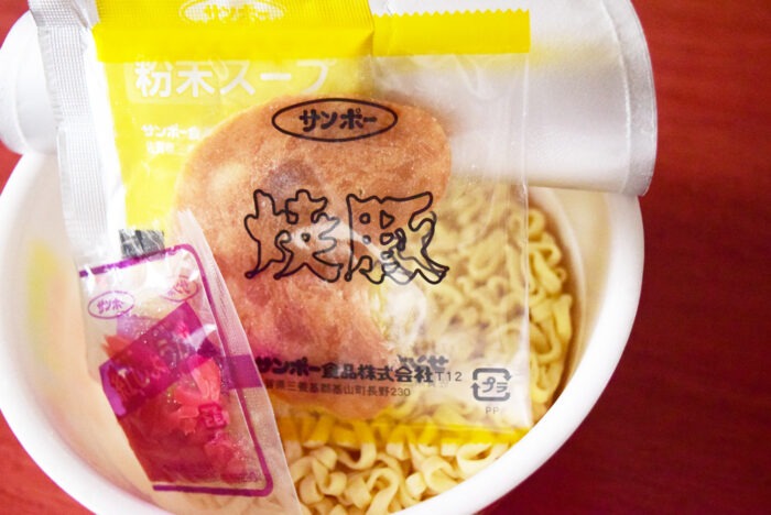 カップの中には粉末スープ・焼き豚・紅ショウガが入っています。