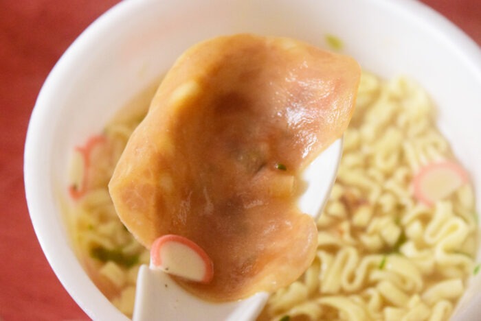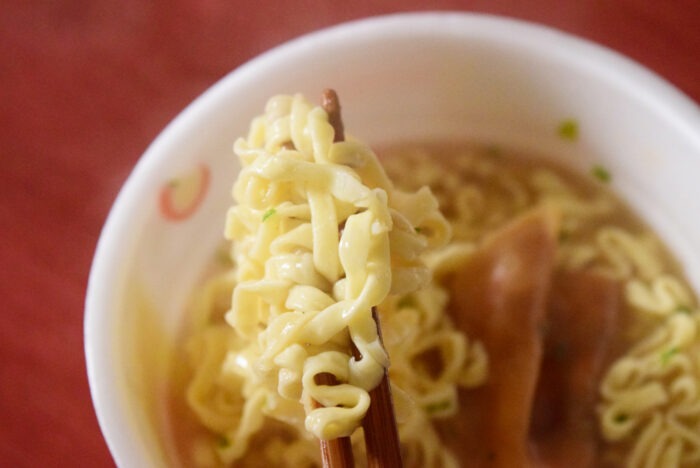 麺はちぢれがきつく、スープをよく絡めます。ラーメンとのことですが、麺はどう見てもうどんです。ちなみにサンポーはフライ麺の香りが結構きついものが多いですが、本商品は油の香りもきつくなく非常に食べやすかったです。