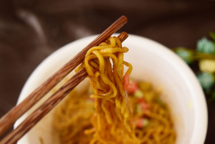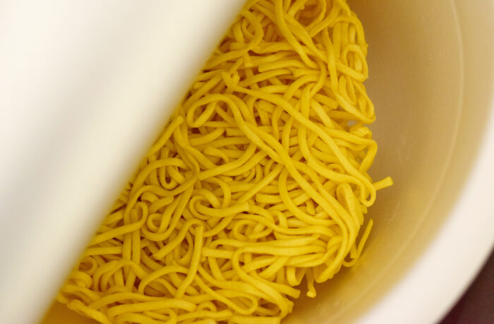 1度ゆでた麺を乾燥させることによって、お湯をかけた時に生麺の食感を生み出しています。東洋水産オリジナル技術です。