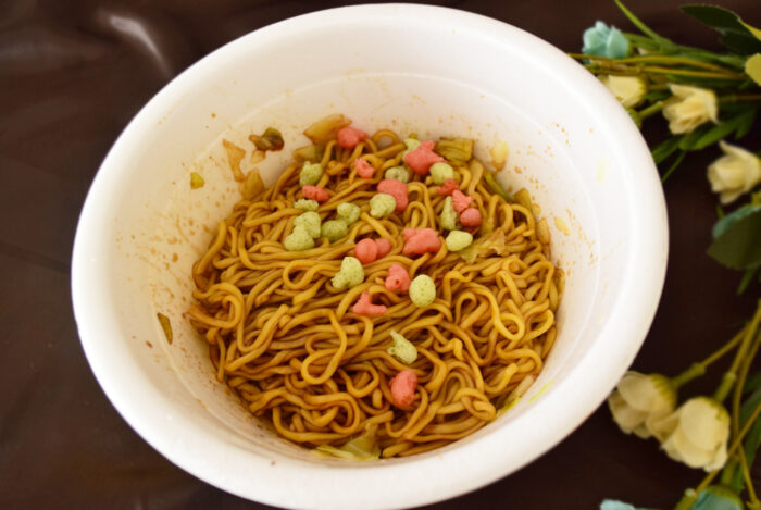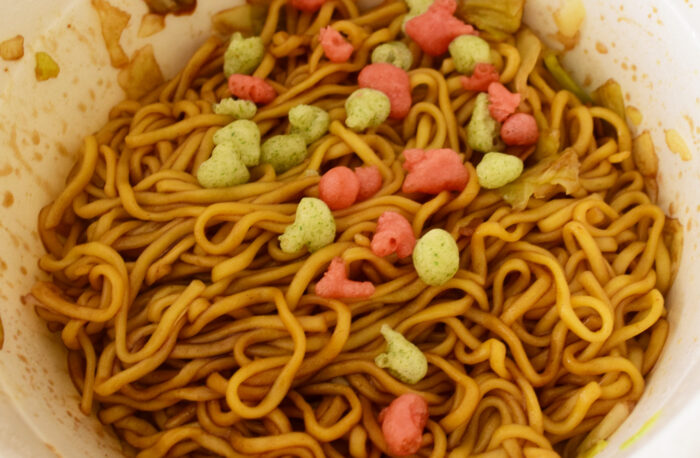 お湯を入れて5分後。湯切り口からお湯を捨て、ソースとかやくを混ぜたら完成です。