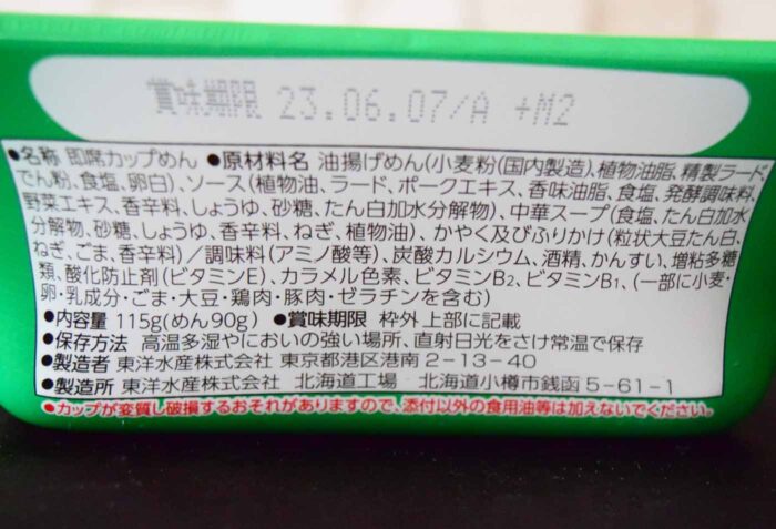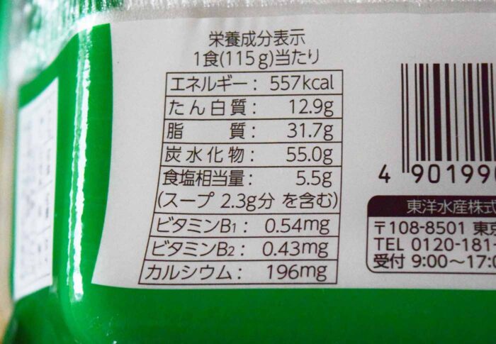 1食(115g)あたり557kcal。炭水化物は55gで食塩相当量は5.5g(やきそば3.2g、スープ2.3g)。