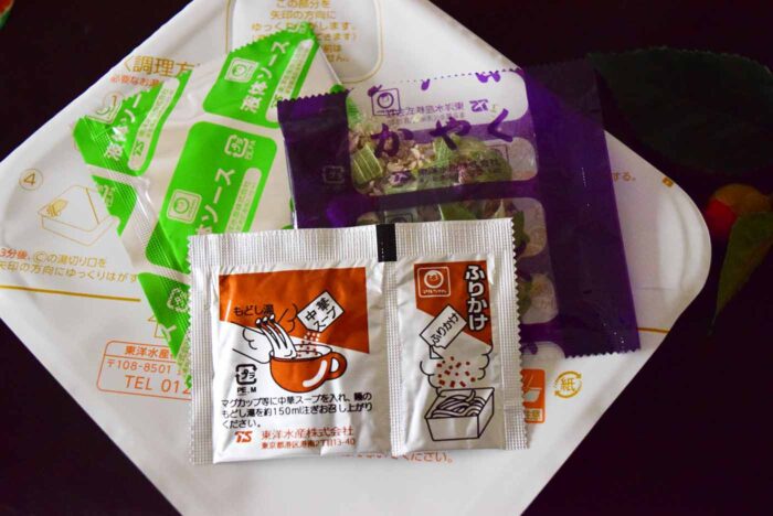 カップの中には麺の他に後入れソース、中華スープ、かやくなどが入っていました。