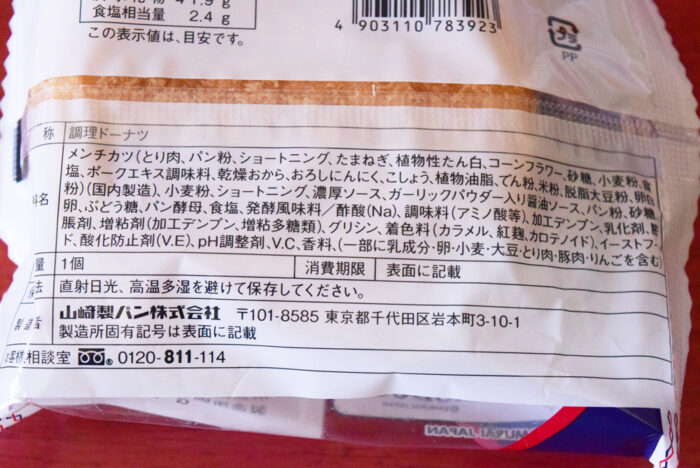 原材料はメンチカツ(とり肉・パン粉・ショートニング・たまねぎ・植物性たんぱく・コーンフラワー・砂糖・小麦粉・食塩・ポークエキス調味料・乾燥おから・おろしにんにく・こしょう・植物油脂・でん粉・米粉・脱脂大豆粉・卵白粉)小麦粉・ショートニング・濃厚ソース・ガーリックパウダー入り醤油ソース・パン粉・砂糖・卵・ぶどう糖・パン酵母など含まれています。