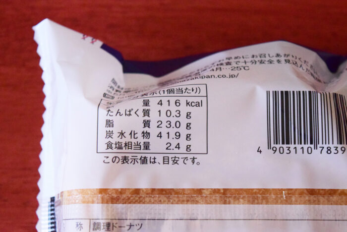 1個当たり416kcal。たんぱく質10.3g・脂質23g・炭水化物41.9g・食塩相当量2.4gです。