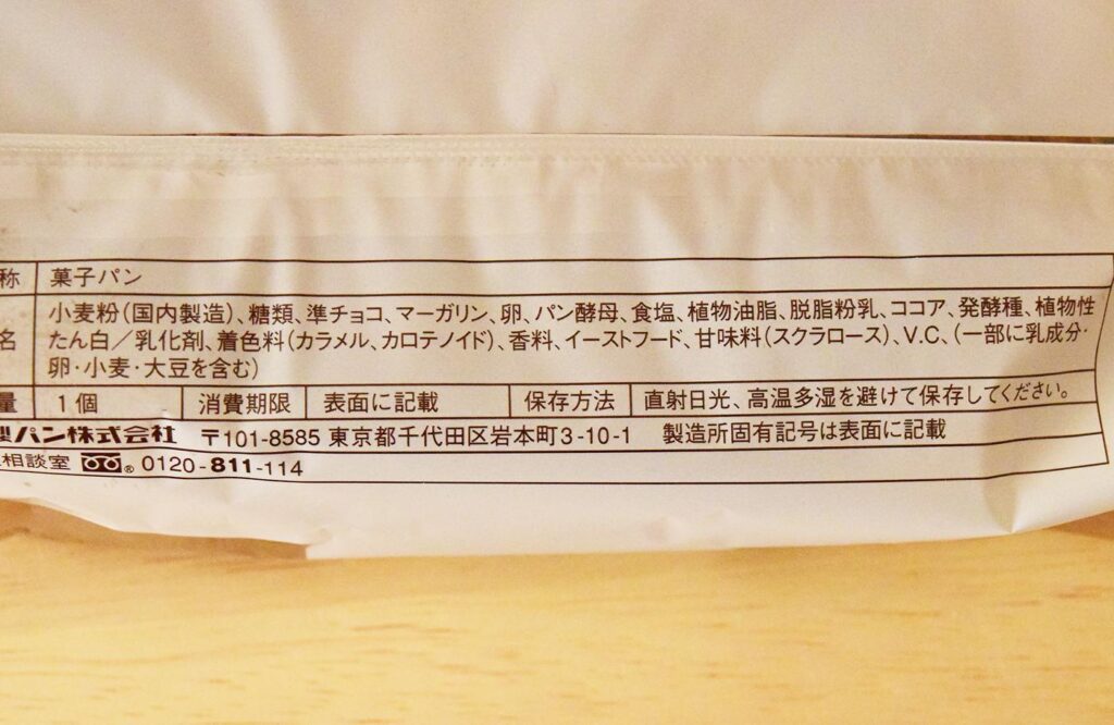 原材料は小麦粉・糖類・準チョコ・マーガリン・卵・パン酵母・食塩・植物油脂・脱脂粉乳・ココア・発酵種などが使われています。