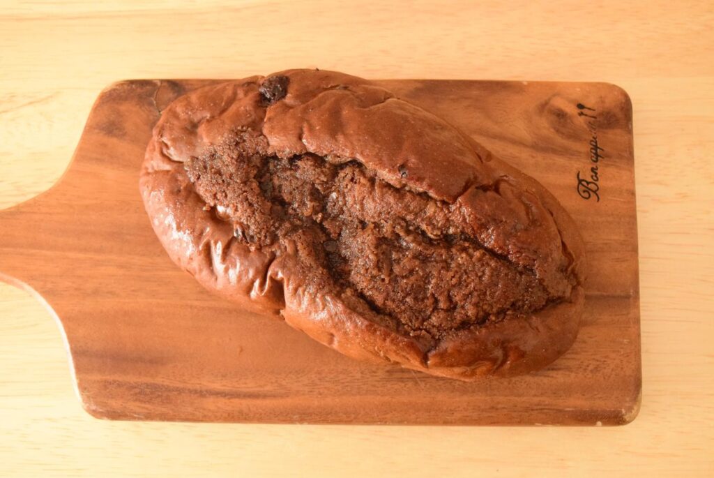 食べてみると生地はしっとりしていますが、チョコっぽさはあまりありません。真ん中のチョコが焼けているような見た目の部分は、砂糖が塗られていてじゃりじゃりとした食感が気になります。チョコの甘さや旨みではなく、ザラメの甘さが際立っているパンなので、見た目で想像した味とは大きく異なりました。