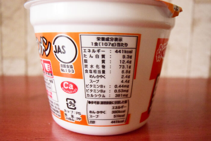 1食(107g)当たり441kcal。たんぱく質9.3g・脂質12.4g・炭水化物73.1g・食塩相当量6.8g(めん・かやく2.4g・スープ4.4g)です。