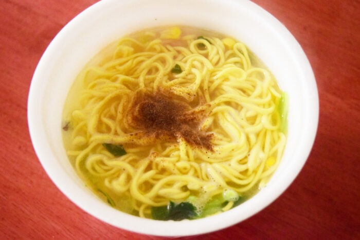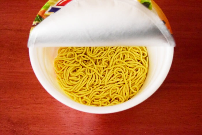 カップの中にはかやく入り粉末スープ・超やみつきペッパーが入っています。