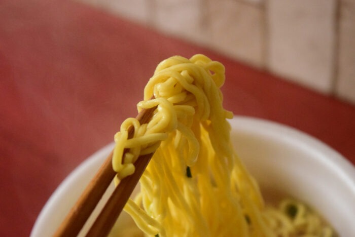 麺はスーパーカップの醤油とほとんど同じです。コシがあり食べ応え十分の麺です。美味しいですし、スープとよく合っていました。